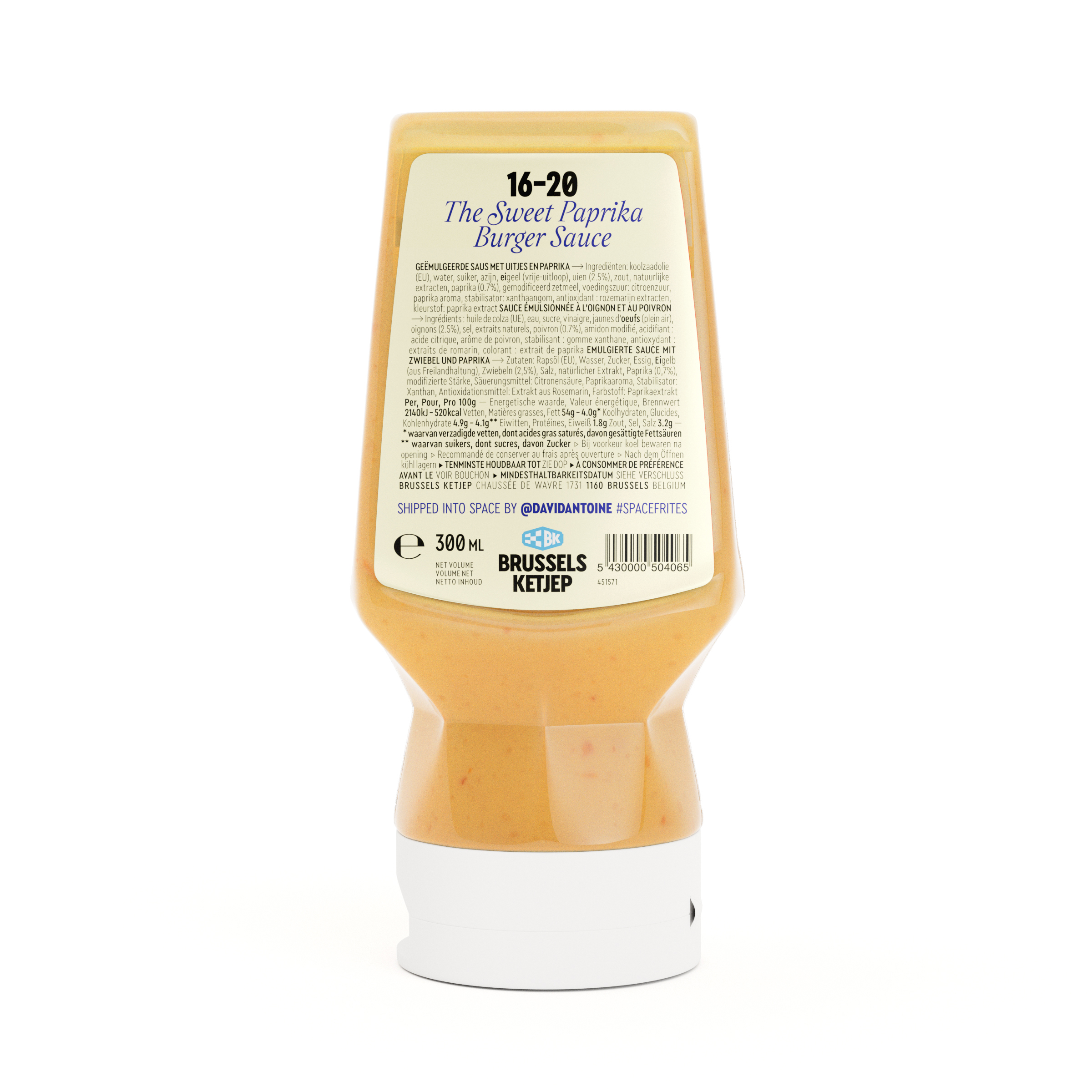 Op het flesje van dit BK saus prijkt de naam 16-20, een referentie naar de bekende radio-uitzending van David Antoine. In het flesje ontdek je een unieke smaak van gebakken uien en paprika. Karakteristiek zoet met een lichtzure toets.